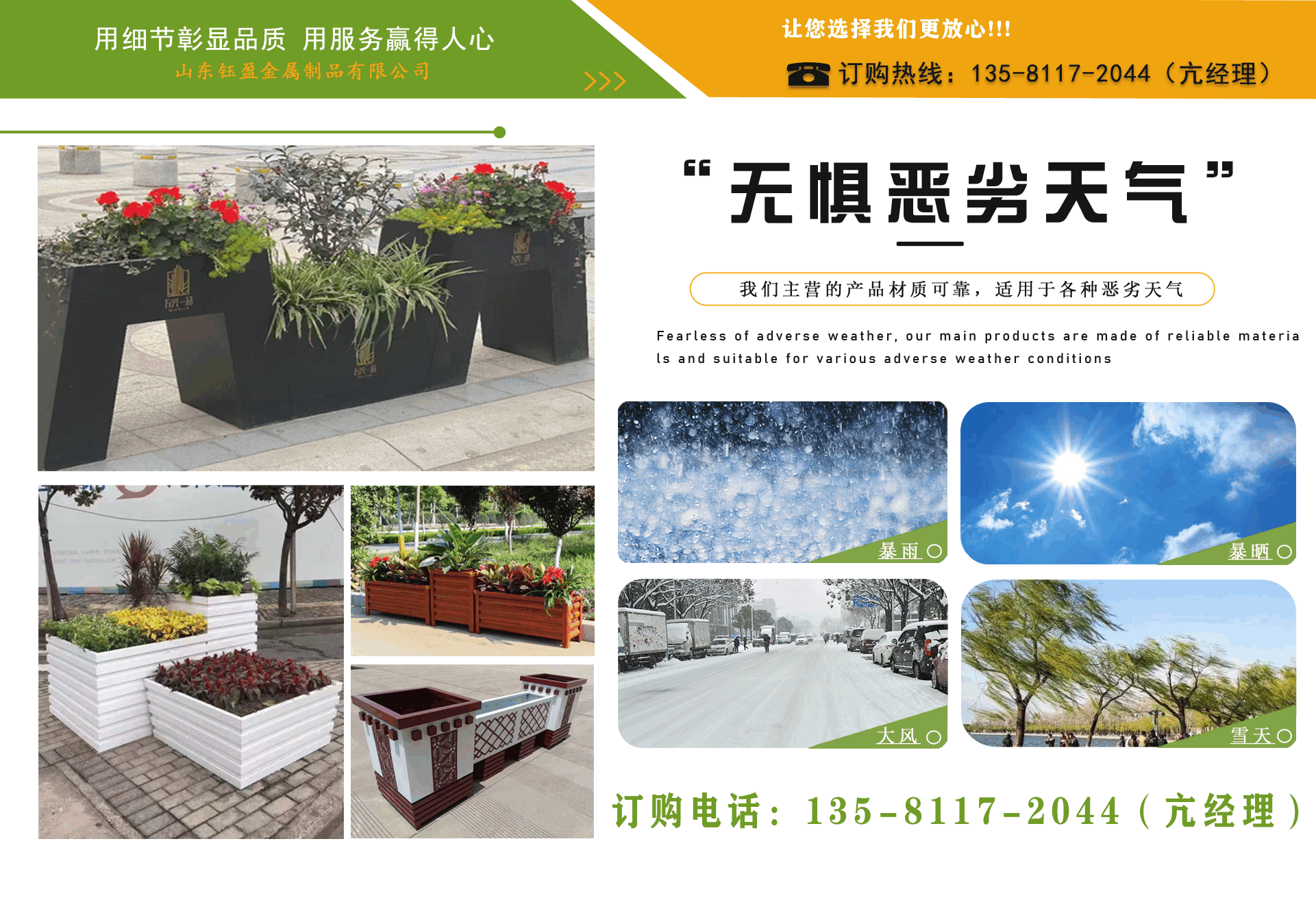 山東鈺盈金屬制品有限公司主營鍍鋅板花箱,道路隔斷花箱,定制花箱,戶外道路花箱,花箱座椅等產品,產品結構合理、性能優良,具有強度高、耐腐蝕、抗老化、隔熱隔音、節約能源、外形美觀、使用壽命長等優點,深受國內外客戶認可?! ∥覀兏鶕蛻羲诔鞘械奈幕卣鳎圃斐龇袭數爻鞘形幕瘹庀⒌淖匀涣Ⅲw、觀賞性強的花箱產品成為城市里一道靚麗的風景線?! 」緦嵭姓\實、公正、守信、價格合理、平等互利。 公司憑借雄厚經驗實力,恪守誠信為本的原則,得到了眾多客戶的信賴,并在業界獲得良好的口碑。建立了穩固的合作關系,隨著業務的不斷發展和壯大,合作伙伴的范圍也在不斷擴大。我們熱情盼望與您的合作,為社會的可持續發展獻上一份努力。...